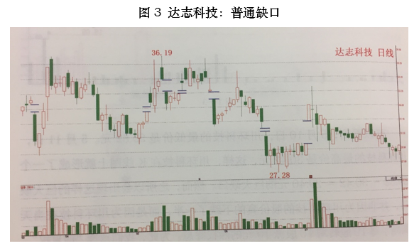 可以看到,达志科技5个月内的股价都在27.28-36.19之间震荡,期间有多个向上或向下的跳空缺口,但这些缺口并未形成趋势性行情,没过多久就回补,操作时时刻关注股价回补,被称为普通缺口。