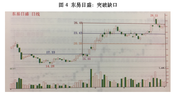 东易日盛在向上突破颈线时跳空高开,此后股价一路向上未回补,这便是突破缺口。