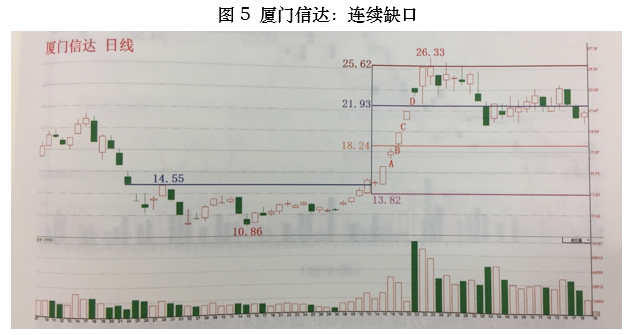 厦门信达在构筑了一个多月的圆弧底后,10月13日,向上突破14.55元的颈线,后连续出现A、B、C、D四个高开缺口,其中A、B、C按个缺口之后继续上涨,属于连续缺口,而D缺口则后期被向下回补,视为竭尽缺口,我们可以等股价回落至竭尽缺口D时设置止盈,即21.39元,假设我们在颈线14.55元这个最佳建仓点入场,此时收益率为21.39/12-1≈47%。