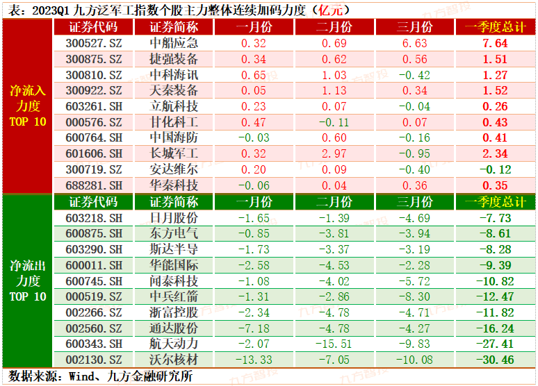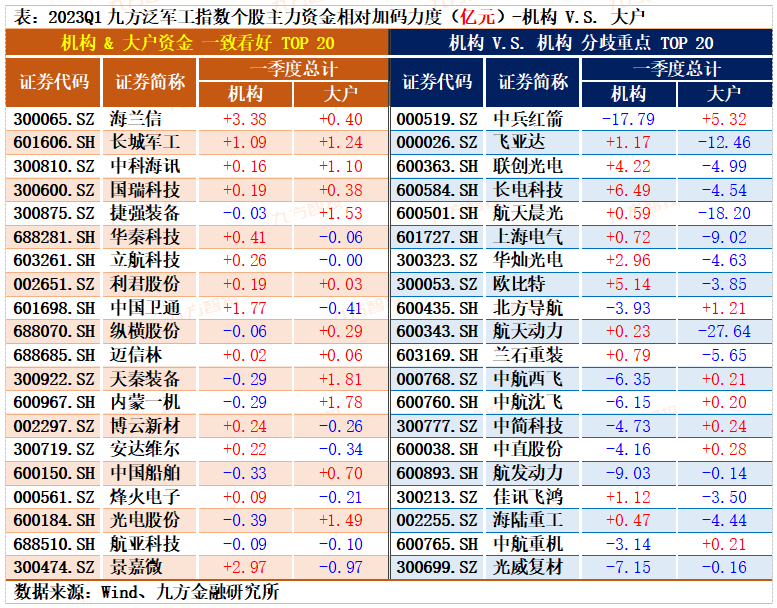 依照一季度期间机构资金与大户资金各自的净流入表现静态来说,主力资金一季度关注的一致方向与上述的动态结论基本一致;但是,在关注重点的分歧方面,机构与大户资金在中航沈飞、航发动力等核心权重/白马龙头上存在着明显不同,相关个股大概率是主力资金一季度博弈国防军工的“主战场”。