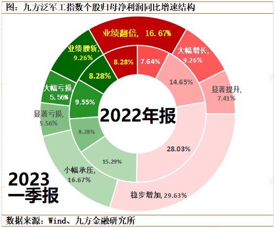 从板块业绩增速结构来说,23Q1实现净利润同比增长的军工上市公司比例(59.55%)略超年报同增比例(58.6%);同时,一季度录得业绩倍增的方军工个股比例也是年报的两倍。国防军工领域的上市公司的一季度业绩增长势头明显向好;军工板块的业绩成长主线有望在2023年回归再起航。