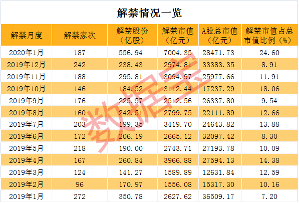 2020年1月A股共有187家次上市公司解禁,涉及股份557亿股,对比2019年全年,本月A股解禁股份数量排名第一,解禁市值为7004亿元,重回3000亿元大关以上,解禁市值占A股总市值比为24.6%,创下2015年6月以来的单月新高。