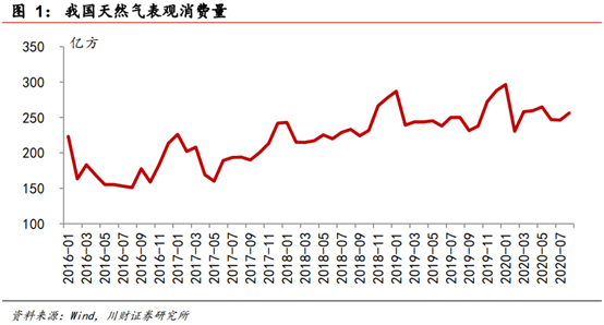 天然气需求的季节性十分明显,冬季气温的波动对天然气需求的影响较大。自10月份开始,全国陆续进入供暖季。上半年虽然受到疫情影响,但天然气消费仍保持正增长,同比增长1.2%。