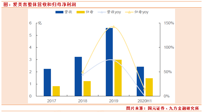 从全公司业务规模来看,华熙生物19年收入达18.86亿元,归母净利润5.86亿元,是3家公司中收入和净利润最大的企业;昊海生科次之,19年实现收入16.04亿元,归母净利润3.71亿元;爱美客由于只涉足医美业务,19年实现收入5.58亿元,归母净利润3.06亿元。