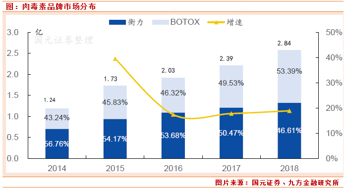 依据IQVIA样本医院数据,2014年肉毒毒素市场为1.24亿元,到2018年为2.84亿人民币,4年实现翻番。样本医院多为公立综合医院,粗估放大10倍系数,整个肉毒素市场预计在28.4亿元。从竞争格局看,定位高端人群的BOTOX市场份额增加较快,而定位较低的衡力市场份额却在减少,可见医美行业也在呈现消费升级趋势。