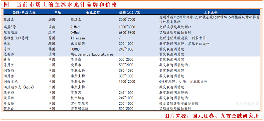 水光针属于非交联透明质酸产品,通过水光注射仪器的负压技术配合一组(5针或9针)一次性针头均匀的将营养成分注射到皮肤的中胚层和真皮层中,全过程10-20分钟,全脸注射量一般为2.5-5.0ml。水光针主要作用是补水,维持的时间较为有限,一般一个疗程3次,1-3个月注射一次,效果可以维持3-6个月左右,购买频次较高,单次价格在600-10000左右。目前市场上主流水光针进口品牌是法国菲洛嘉、、瑞典兰、美国乔雅登以及韩国海珠,国产品牌主要是华熙生物的润百颜。