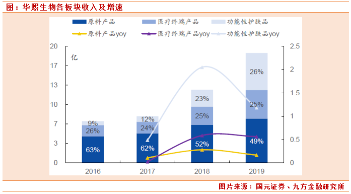 公司目前拥有原料(占40.35%)、医疗终端(占25.93%)、功能性护肤品(占33.65%)三大板块,19年实现收入18.86亿元,其中功能性护肤品18、19年增速高达205.04%、118.53%,产品种类从次抛原液扩展到各类膏霜水乳、面膜、洗发水、手膜、喷雾等,陆续推出了14个子品牌,品牌储备丰富,后续有望再造规模化品牌,功能性护肤品有望继续拉动公司业绩提升。