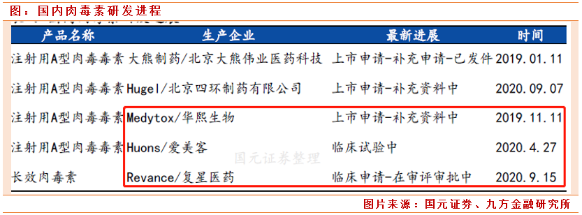 我国监管较严格,长期以来国内获批的肉毒素只有2款,分别是1997年获批的国产兰州所的衡力、1998年获批的英国艾尔建的Botox,直到2020年6月才有第三款肉毒素上市,为英国Ipsen的Dysport,其在欧洲地区销售量位居第一。Botox终端价格约3000-5000元/unit,衡力则为2000-3000元/unit。目前在研的肉毒素有爱美客的Hutox、华熙生物的Medytox和复星医药的Revance。