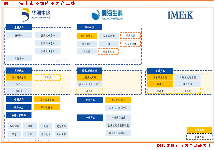 从业务板块和发展战略看,华熙生物从透明质酸原料出发布局上下游,拥有原料、医疗终端(含医美)、功能性护肤品3个业务板块,护肤品是目前成长最快板块;昊海生科拥有眼科、整形美容与创面护理、骨科、防黏连及止血4个业务板块,目前眼科和医美是公司核心板块;爱美客专注医疗美容填充领域,在布局透明质酸填充产品外,还拓展至其他功能性填充产品。