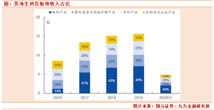 昊海生科是生物医用材料龙头企业,多个细分领域行业领先。公司专注于眼科、整形美容与创面护理、骨科、防黏连及止血4个领域,其中眼科业务占据营收半壁江山。