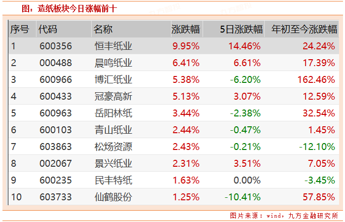今日纸业板块备受资金青睐,截至A股收盘,恒丰纸业涨停,晨鸣纸业、博汇纸业、冠豪高新等涨幅超4%;期货市场上同样表现抢眼,纸浆主力合约涨停,涨幅达5%。