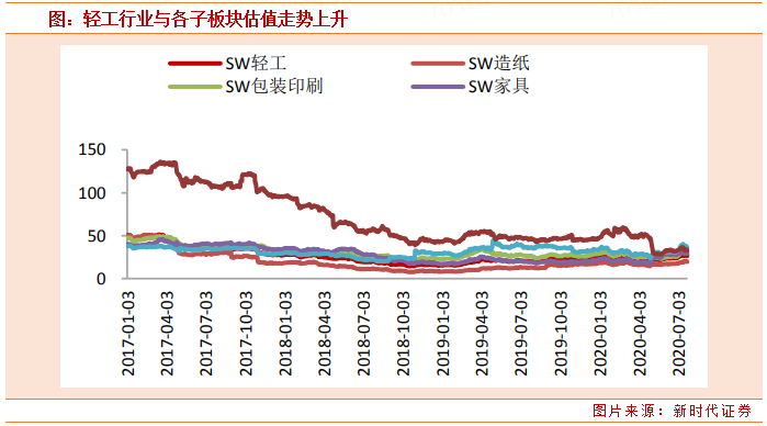 从估值情况来看,截至2020年8月28日,轻工制造板块PE(TTM)为28.67X,较前一周估值下降,位于申万板块中游水平,市净率PB为2.15。轻工子板块中家具估值上升,其余板块估值均下降。依次为珠宝首饰(36.28X)、文娱用品(34.20X)、包装印刷(32.55X)、家具(31.32X)、造纸(21.21X)。