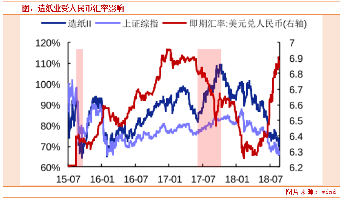 造纸原料主要为废纸和纸浆(木浆+非木浆)。目前,中国造纸行业废纸自给率63.8%,纸浆自给率仅有43.9%,剩余需要依赖进口。而从A股历史走势看,人民币升值时,造纸为首先受益板块。