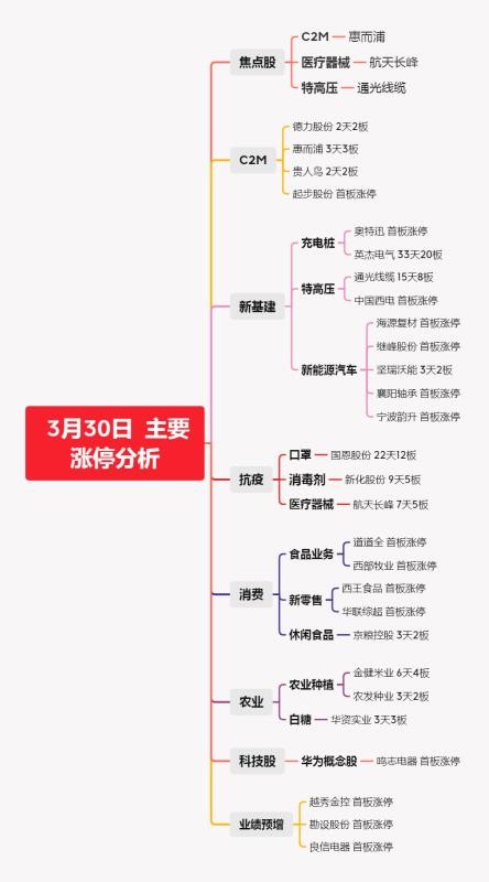 板块题材上,C2M概念来看,上周五大批量涨停,但今天只留了3个活口,惠而浦、德力股份、贵人鸟。这周节奏,很明显,就算是拿先手都不一定赚钱,更别说后手接力了。