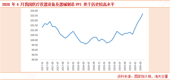 据国家统计局数据,2020 年4 月,我国医疗仪器设备及器械制造PPI 为102.7(上年同月为100),处于历史较高水平,我们认为主要受疫情影响,一季度国内医疗器械需求激增,海外疫情二季度爆发,对医疗器械需求激增,我国作为全球第二大医疗器械生产国,企业备货量大幅增加。
