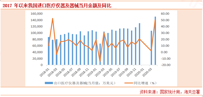 据海关总署数据,2020 年4 月我国医疗仪器及器械出口金额为15.09 亿美元,同比增速为50.29%,处于历史较高水平,主要是海外疫情快速扩大导致对国内器械需求激增;截止4 月底累计出口金额为41.81 万美元,累计同比增速11.00%走出年初的低迷状态。