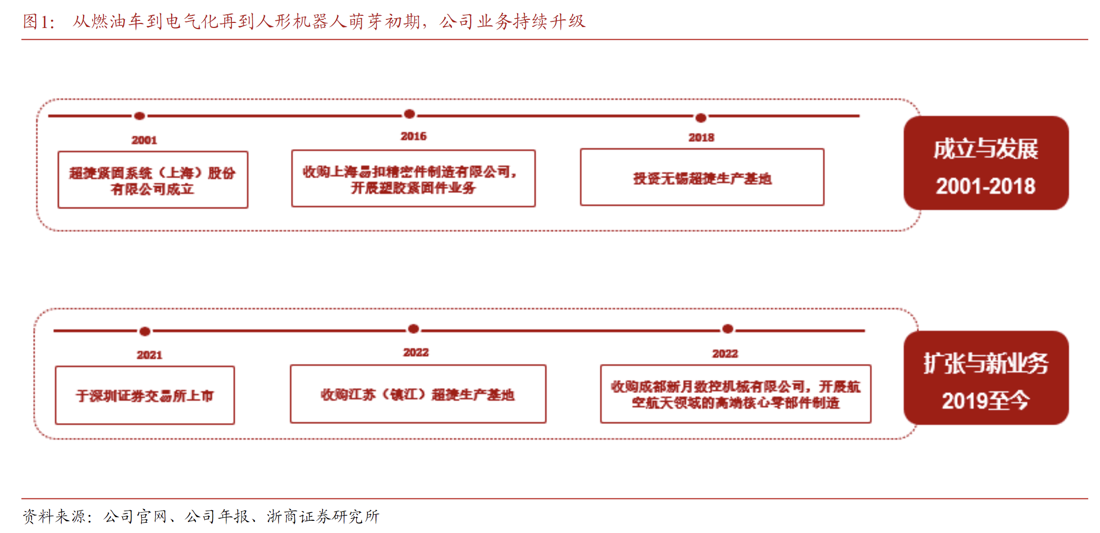 初创与专业化时期(2001–2018年):公司2001年在上海成立,专注高强度精密紧固件与异形连接件,产品应用于汽车涡轮增压、换挡控制等核心系统,获法雷奥、博世、麦格纳等一级供应商认可,展开深度合作。2016年公司收购上海易扣精密件制造有限公司,拓展塑胶紧固件业务;2018年投资无锡超捷生产基地,产能与品控体系持续升级。