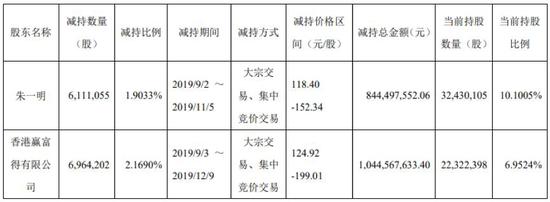 公告数据显示,2019年9月2日至12月9日,朱一明及香港赢富得减持金额合计约18.89亿元,减持数量约占公司总股本的4.07%。