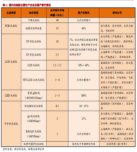 2019年中国光刻胶市场本土企业销售规模约70亿元,全球占比约10%,受益于半导体、显示面板、PCB产业东移的趋势,未来发展空间巨大。