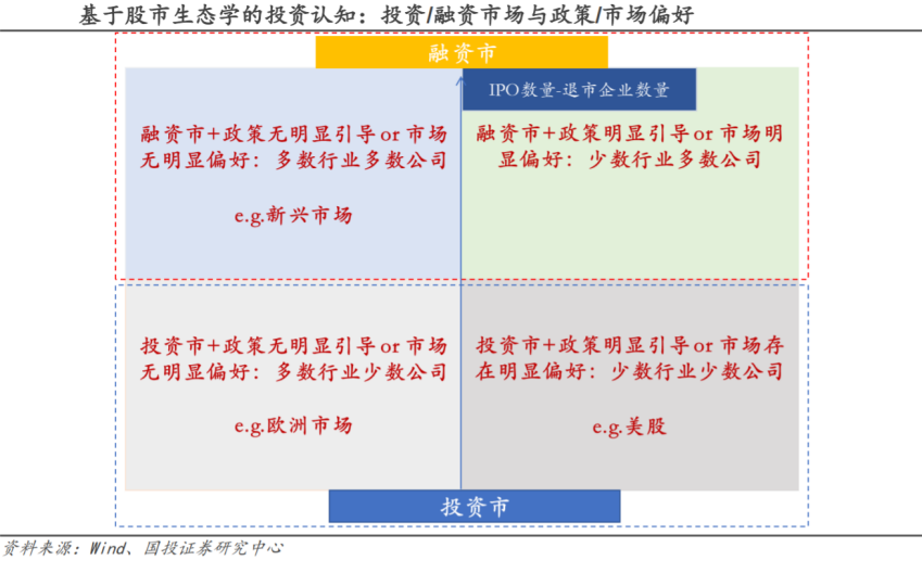 基于全球股市生态的观察,可以根据投资/融资市场与政策/市场是否存在偏好,使得不同股市呈现不同的生态特征: