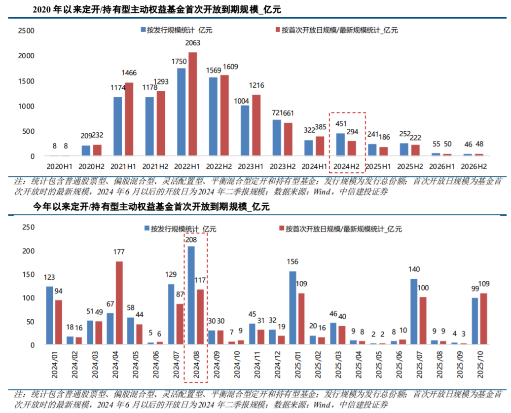 定开与持有期主动权益基金集中开放赎回。今年下半年迎来又一批定开和持有期基金首次到期开放的小高潮,按发行规模统计合计约451亿元。8月首次开放的定开和持有期主动权益基金规模较大,按发行规模统计超过200亿元,按最新规模统计超过110亿元;8月以来大盘整体震荡下行,资金面的赎回压力可能有一定影响,但8月以后年内即将首次开放的基金规模较小。