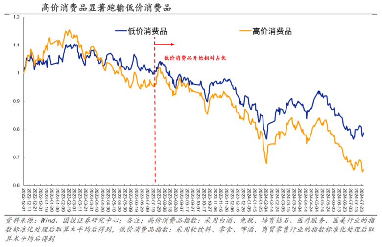 从消费内部的结构来看,呈现出低价消费品(商贸零售、零食乳制品等)显著跑赢高价消费品(指白酒、医疗服务等消费升级方向)的现象。自2023年年中以来,低价消费品开始明确占优,这一现象在今年6月茅台出现波动之后进一步得到强化。以年初至今测算,高价消费品跌幅达到15.76%,而低价消费品跌幅6.71%,呈现出显著跑赢的趋势(高价消费品指数:采用白酒、免税、培育钻石、医疗服务、医美行业的指数标准化处理后取算术平均后得到,低价消费品指数:采用软饮料、零食、啤酒、商贸零售行业的指数标准化处理后取算术平均后得到)。