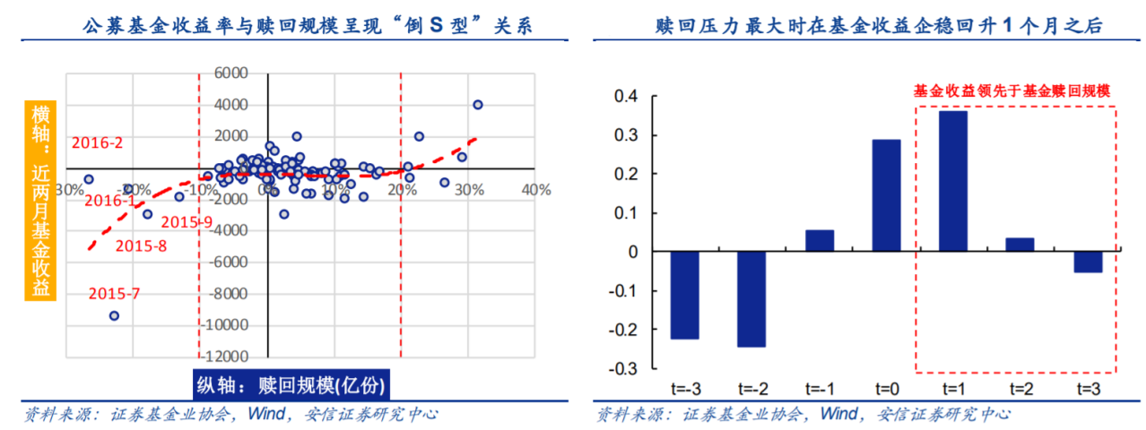 基金收益与赎回规模间呈现明显的“倒S型”关系,即当基金收益率变动不大时,赎回规模与基金收益率相关性并不强;而当基金净值下跌超过15%或上涨超过20%时,基金收益与赎回规模开始呈现出明显的正相关,具有“追涨杀跌”特征:收益超过20%时,申购会明显增加;收益下跌15%时,赎回会明显增加。