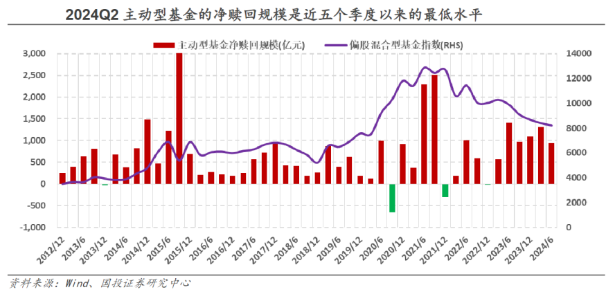 5)当前市场,公募基金面临赎回的言论甚嚣尘上,据最新披露基金二季报数据进行推算,Q2主动型公募基金(包括偏股混合型、普通股票型、灵活配置型和平衡混合型)的净赎回规模为983亿元(基金季报披露的净赎回份额乘以季度期初和期末的平均单位净值求得),是近五个季度以来最低水平,环比2024Q1的1307亿下降28.2%。