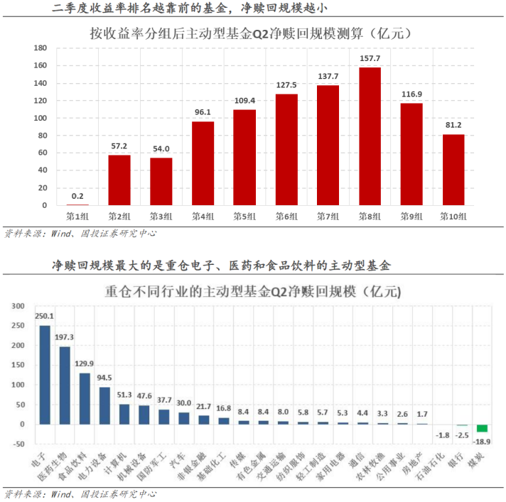 二季度净赎回规模最大的是重仓电子、医药和食品饮料的主动型基金,而重仓煤炭、银行、石油石化的主动型基金整体还获得净申购。二季度公募基金赎回压力并没有显著提升。