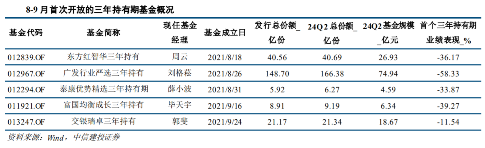 具体来看,8-9月共有11只基金迎来首次开放,其中规模较大的是5只首次开放的三年持有期基金,分别是东方红智华三年持有、广发行业严选三年持有、泰康优势精选三年持有期、富国均衡成长三年持有和交银瑞卓三年持有,基金最新规模合计131.5亿元。基金成立后的首个三年持有期内,5只基金都出现了不同程度的浮亏,其中广发行业严选三年持有以新能源投资为主,近三年回撤较大。