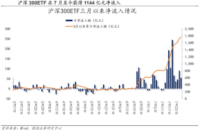 3)被动式投资,尤其是权益ETF或是最具潜力的发展导向与明确的增量资金来源。ETF资金本周再度大幅流入沪深300,流向小盘风格的中证500和中证1000的趋势仍在持续。市场近期的增量资金主要来源于ETF层面的流入。从沪深300ETF净流入规模来看,6月份共计净流入341.5亿元,而7月以来沪深300ETF再度获得1144.2亿元净流入,仅上周就净流入628亿元,本周进一步净流入292亿元。这是3月份以来首次出现ETF集中流入的现象,对于稳定A股市场和投资者情绪有重要的正向作用。