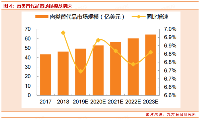 从全球市场来看,据Markets and Markets数据,2018年全球肉类替代品市场约为310亿元,预计将每年以68%的复合增长率增长,到2023年将达到440亿元;此外国外的肯德基、星巴克,国内的来伊份、金字火腿等均陆续推出人造肉产品,人造肉有望迎来蓝海市场。
