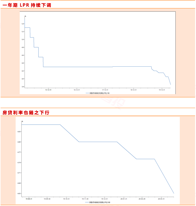 事 件:中国人民银行授权全国银行间同业拆借中心公布,2020年4月20日贷款市场报价利率(LPR):1年期品种报3.85%,上次为4.05%,下降20BP并创去年8月份启动以来单次最大降幅;5年期以上品种报4.65%,上次为4.75%