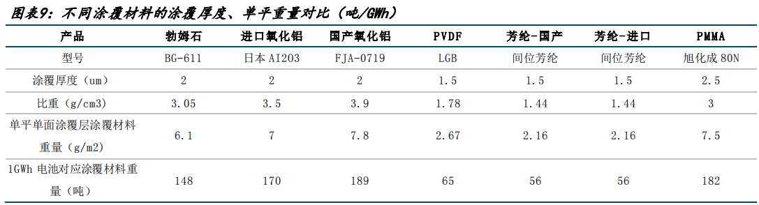 传统方案上,目前无机涂覆材料主要有氧化铝、勃姆石;有机涂覆材料主要有PVDF、PMMA等。从牢固性、透气性、耐热性等指标上看,无机和有机涂覆材料各有优劣,互补性较强。电池能量密度迭带驱动下,有机涂覆需求不断上升。其中,芳纶因兼具有机&无机材料特点,是目前最理想的涂覆材料。