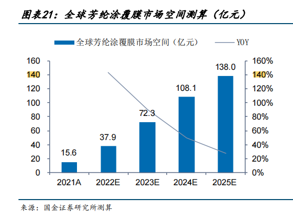市场空间方面,根据全球锂电池需求、涂覆膜需求建模,在中性假设下,机构测算25年全球芳纶涂覆膜市场有望达到140亿规模,CAGR=73%,成长空间和增速都非常可观。