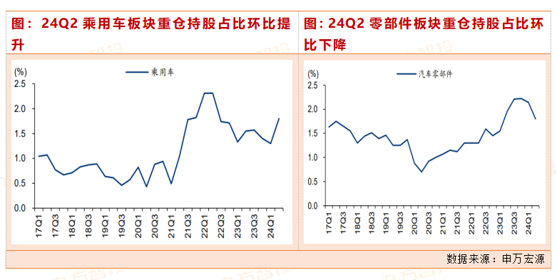 从基金持仓来看,24Q2汽车行业重仓持股市值累计为1128.4亿元,环比增加47.1亿元;市值占比环比提升0.26pct至4.24%。分子行业来看,以全部基金为统计口径,乘用车板块持仓占比同环比均有提升,同比+025pct,环比+0.5pct至1.8%;零部件板块热度有所下降,24Q2持仓占比同环比分别-0.15/-0.34pct至1.8%;商用车板块24Q2 持仓占比0.33%,同比+0.2pct,环比+0.05pct。