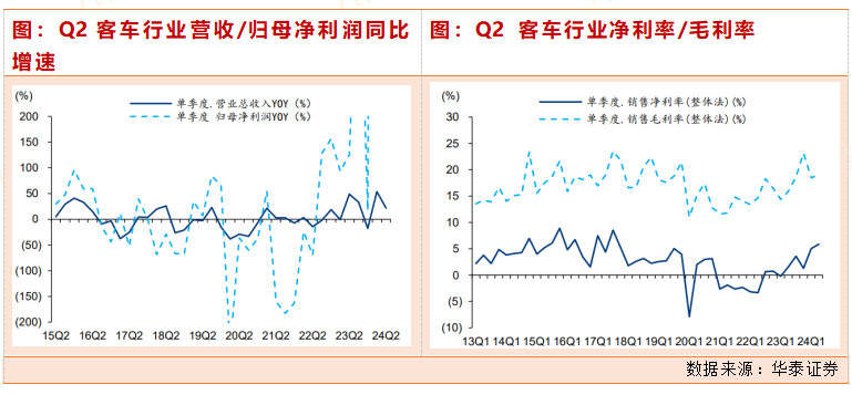 24Q2客车行业出口表现继续强势,板块归母净利润同比大幅增长。24Q2客车板块营业收入同比增长21.8%,Q2 板块合计归母净利润同比高增290%。我们看好海外新能源客车需求增长带动中国客车出海主线延续,助力板块盈利能力不断向好,24Q2客车板块毛利率为19.1%,同环比分别+3.18/+0.65pct;净利润率达5.9%,同环比分别+4.3/+0.83pct。
