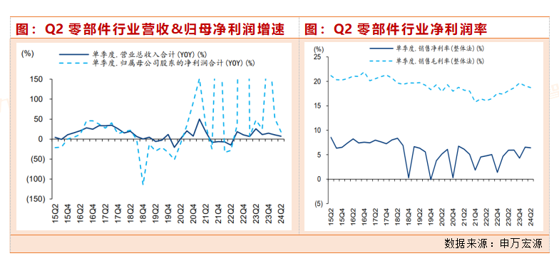 24Q2零部件板块营收同比增长7.3%,归母净利润同比增长17.7%,环比略增3%。行业毛利率为18.7%,同环比+0.62/-0.35pct;净利率为6.4%,同环比+0.5pct/-0.13pct。