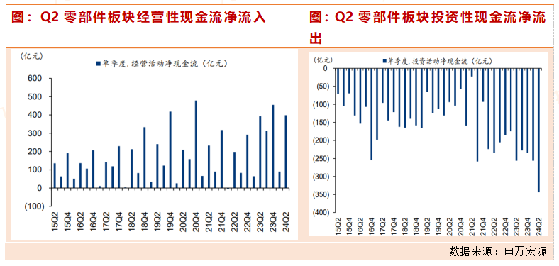 24Q2零部件板块经营性现金净流入397.7亿元,同环比分别+4.99/307.96亿元,Q2现金流环比回升或系年降谈判落定回款改善;投资性现金流净流出343.7亿元,环比增加流出87.4亿元,同比多流出87.5亿元。