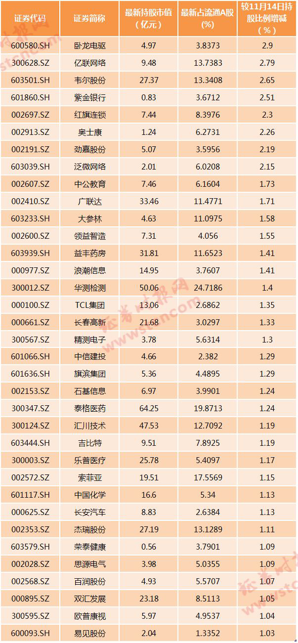 Wind统计数据显示,从占流通股的比例来看,11月14日以来(截至12月3日),35股的北上资金持股比例较此前增加1个百分点。其中卧龙电驱、亿联网络、韦尔股份、紫金银行、红旗连锁、奥士康、劲嘉股份、泛微网络等8只个股持股比例增超2个百分点。