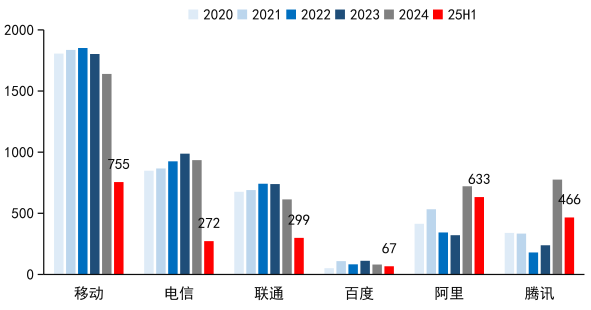 国内三大运营商及互联网企业资本开支情况(亿元) |