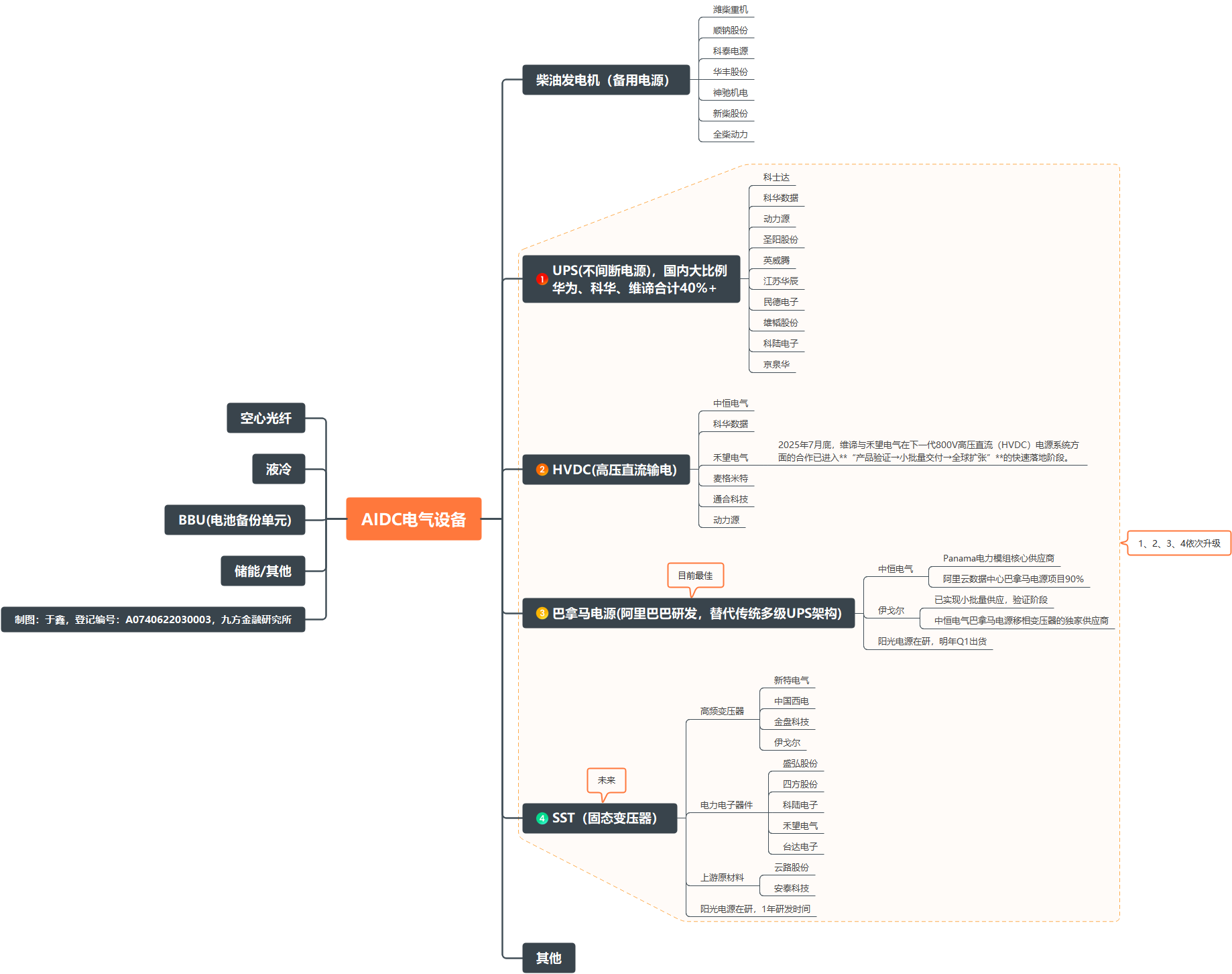电气架构演进升级:数据中心电气架构从传统UPS向HVDC再向固态变压器演进,目标是提升能效、可靠性和功率密度。固态变压器具有高频化、半导体应用和智能控制等优势,在数据中心应用潜力大。