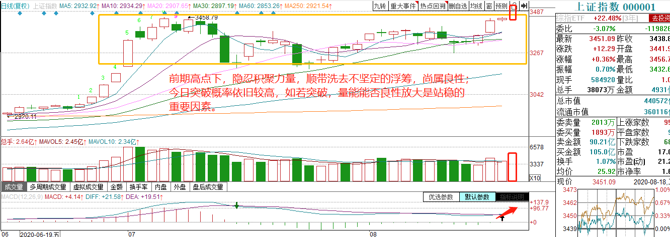1、从指数的走势看,昨日的调整尚属于良性调整。此前的一波是反弹,因为调整周期不足,而这波下—上——下的震荡后,指数重迎多头趋势,距离前高临门一脚,认为突破的概率还是比较大的。突破能否有效放量也是对突破力度判断的重要因素。