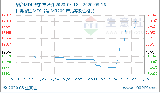 我们重点看一下MDI,MDI下游为冰箱、汽车等,MDI胶可用于制造各种板材,下游应用广泛。根据生意社的数据,截止8月16日,MDI价格14050.00元/吨,30天上涨19.83%。