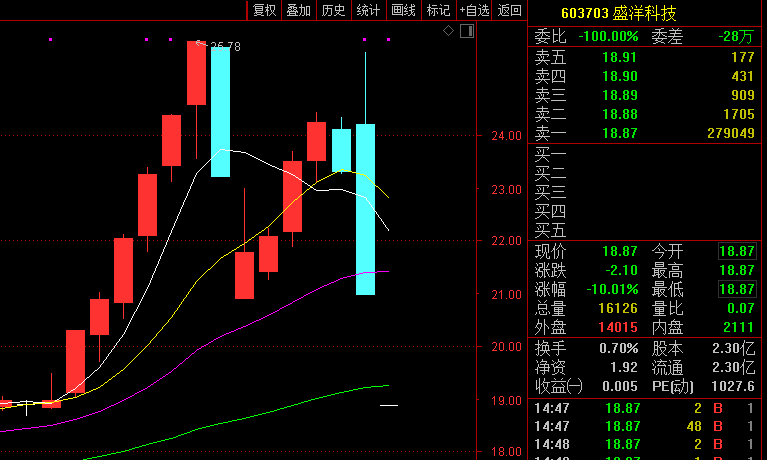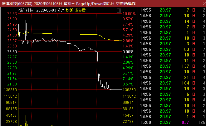 根据行情信息,6月3日开盘后,盛洋科技成交量突然放大,其股价两次冲涨停均未成功,之后其股价维持了一段时间的横盘整理,午后快要收盘的时候,盛洋科技突然闪崩跌停,截至当日收盘,报20.97元/股。盘后数据显示,盛洋科技全天换手率高达30.67%,振幅高达18%。