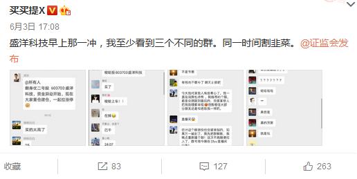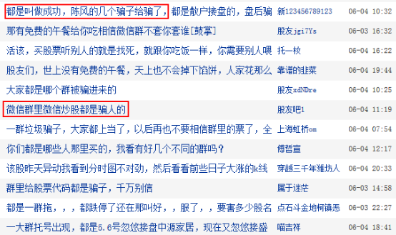 在盛洋科技的股吧中,也有投资者诉说自己被骗的帖子,并有人发起了集合报案的帖子,仅与此次骗局相关的帖子就有超40条之多。有投资者6月3日表示“都被叫做成功,陈风的几个骗子给骗了,都是散户接盘的,盘后骗子们就把群里的人都踢出来了,明天肯定踩踏。”“微信群今天进来几百人,都是有个叫老伍骗进来接盘”,“集合被骗着,我已报案!!!需要大家更多的证据。”