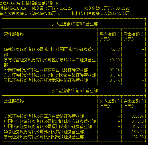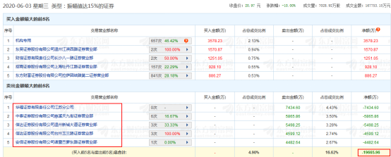 6月3日龙虎榜数据显示,五家卖出营业部分别为华福证券江苏分公司、中泰证券慈溪天九街证券营业部、信达证券温州新城大道证券营业部、信达证券台州玉兰路证券营业部、安信证券诸暨苎萝东路证券营业部,卖出额分别为7435万元、5866万元、5498万元、4599万元、4483万元,而且上述营业部五一买入。买入榜中,除了一机构席位买入超过3000万外,其余四营业部买入额均不多,而且无一卖出。当天龙虎榜净卖出额达到1.97亿元。