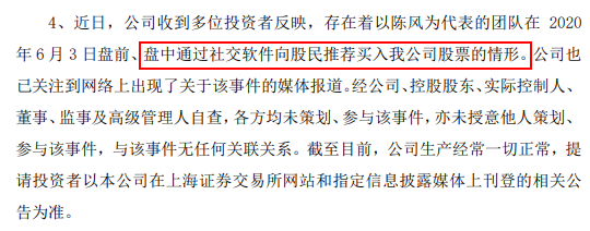 对于这波剧烈震荡,盛洋科技表示“这锅我不背”,并提醒投资者注意风险。盛洋科技称,近日,公司收到多位投资者反映,存在着以陈风为代表的团队在2020年6月3日盘前、盘中通过社交软件向股民推荐买入我公司股票的情形。公司也已关注到网络上出现了关于该事件的媒体报道。经公司、控股股东、实际控制人、董事、监事及高级管理人自查,各方均未策划、参与该事件,亦未授意他人策划、参与该事件,与该事件无任何关联关系。截至目前,公司生产经常一切正常,提请投资者以本公司在上海证券交易所网站和指定信息披露媒体上刊登的相关公告为准。