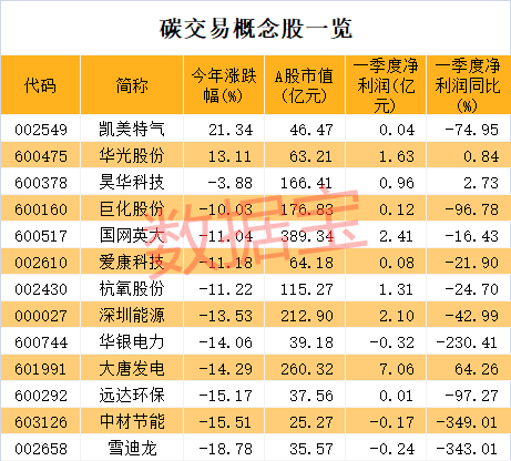 作为《意见》重要部分,碳排放交易相关内容也受到机构普遍关注。数据宝统计发现,A股市场上与碳交易相关的股票有13只。如巨化股份,公司是国内首家实施二氧化碳排放权交易的氟化工企业,具备业界领先的氟化工环保治理技术。深圳能源则参股深圳排放权交易所,涉足温室气体排放权、污染物排放权和减排量等环境权益登记和交易。