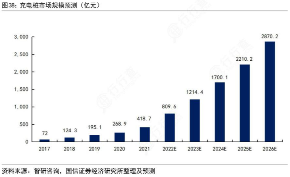 随着“双碳”目标的推进,我国的充电桩建设有望开启新一轮的高增长。根据智研咨询数据,截至2022年底,我国公共充电桩保有量179.7万台,私人充电桩保有量341.21万台。据中国电动汽车充电基础设施促进联盟预测,到2026年底,我国充电桩行业市场规模有望达到2870.2亿元,2021-2026年复合年均增长率将达37.8%。